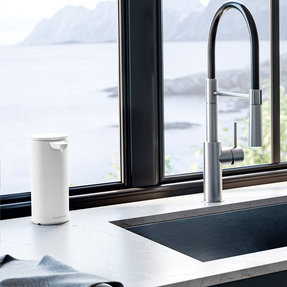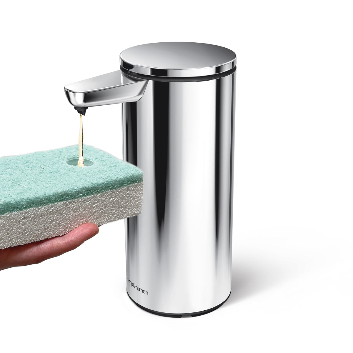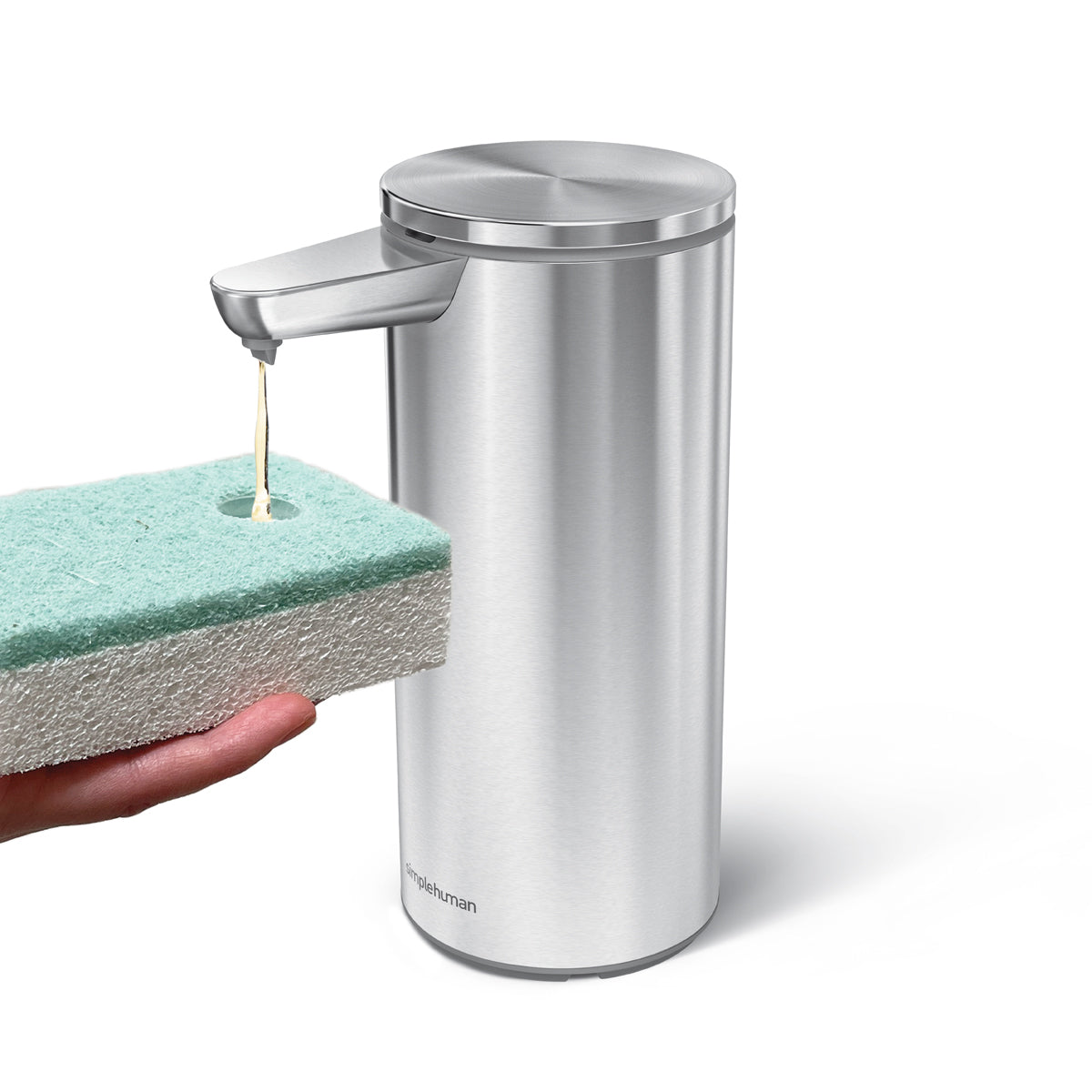 The perfect tool for dispensing soap touch-free without leaving germs behind. Holds 50% more soap than our standard pump so you'll refill less often. Clog-proof tubing pump ensures a precise and consistent flow, and the silicone valve prevents messy drips. To control the amount of soap desired, you can position your hand up close to the sensor for a little soap and farther away for more. A wide refill opening makes refills fast and easy, and there's a QR code under the lid so you can reorder soap in a flash. It's also waterproof for easy cleaning. Rechargeable with included wireless charger — and one charge lasts up to 8 months. Use simplehuman soap for optimum pump performance. Also works with hand sanitizer. Available dual sponge caddy perfectly fits two pumps — one for hand soap and one for dish soap — and stores a sponge so it's always at your fingertips.