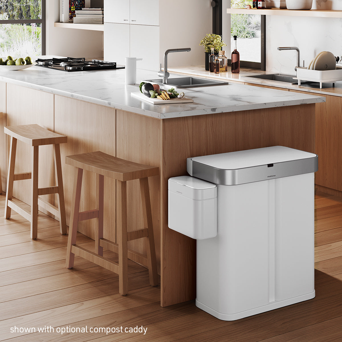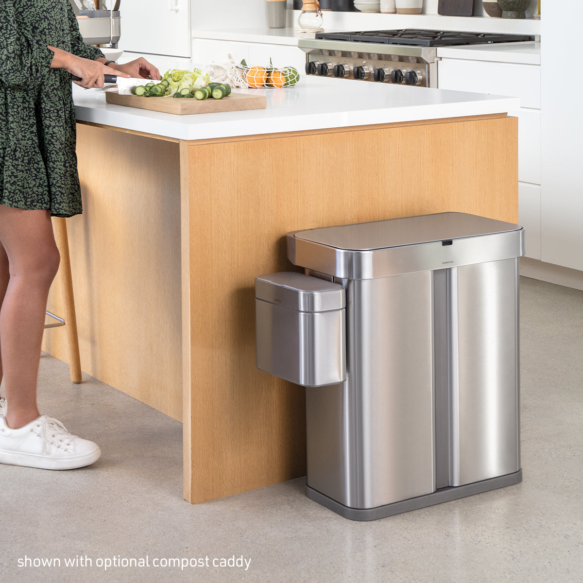 Just say, "open can" and the lid opens automatically, so throwing trash away is quick, efficient and hassle-free. You can also say, “stay open” while performing longer chores or cooking, and the lid won’t close until you say, “close can” (or it will close automatically after 10 minutes). It also has a motion sensor that opens the can with a wave of your hand and is smart enough to adapt to you and the surrounding environment — no false triggers, no unexpected lid closures. Dual compartments make it easy to neatly sort your trash and recyclables in one convenient, space-efficient place. On one side, an innovative liner pocket stores and dispenses liners from inside the can for a faster liner change. The other side has a convenient handled bucket for easy lifting and disposal of all your recyclables. The liner rim lifts up for easy access to the liner, then closes to grip and keep it neatly out of sight. The can's stainless steel surface is protected by an invisible silver-ion coating that resists fingerprints and germs (brushed model only). ADA-compliant. Our Code H custom fit liner fits this can perfectly — no bunching or slipping for a cleaner trash experience. Liner refill packs store easily in this can's liner pocket.